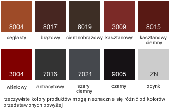 Kolory (RAL): ceglasty (8004), brązowy (8017), antracytowy (7016), wiśniowy (3004), czarny (9005), kasztanowy (3009)